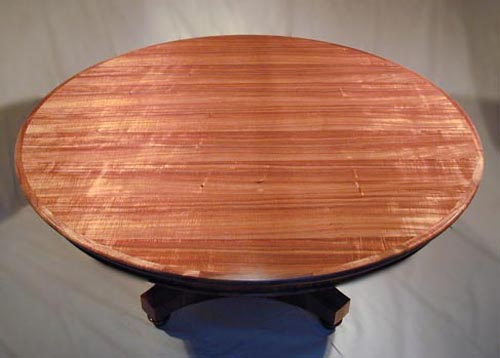 Koa Veneer Center or Dining Tables With Reeded Pedestal This 5'-6" diameter center/dining table, made of 1/8" thick shop cut curly Koa veneer and solid turned center pedestal with reeding is from a 100 year old West Indies Mahogany tree that grew on Kalakaua Avenue in Waikiki. The preferred Mahogany (West Indies Mahogany) of early American furniture makers are very rare and commercially unavailable today. Above shows the fine curly Koa veneer used in these tables.